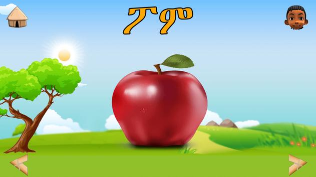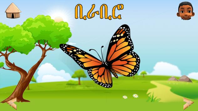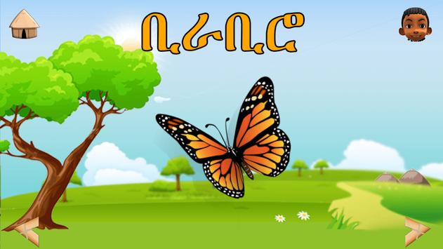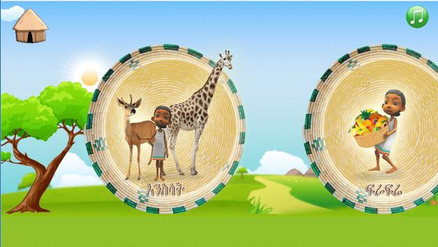 The learning section includes nine common categories (Animal ,Fruit, School, Transportation, Number, Color, Objects, Body part, Weather). Children can learn basic Amharic words, syllables and sounds in any of these categories.