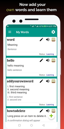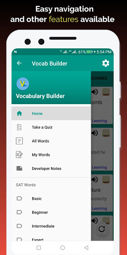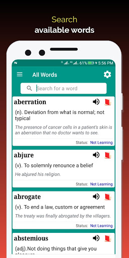 This app, targeted to High School students, contains carefully selected words required for high school level English language. The app also contains vocabulary lists that a student should be familiar with to score high in the new SAT examination. Every word in the app contains a meaning and a sentence to demonstrate its usage. Furthermore, phobias and manias are included for enthusiastic learners.