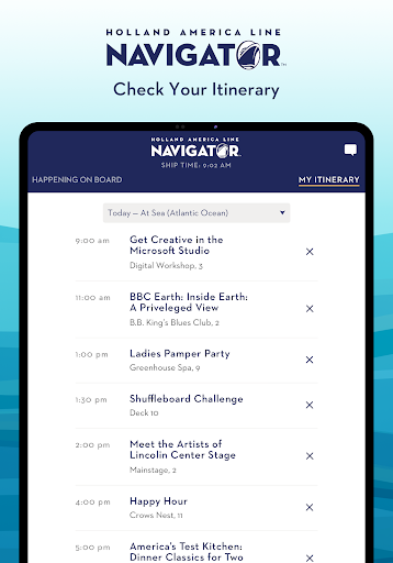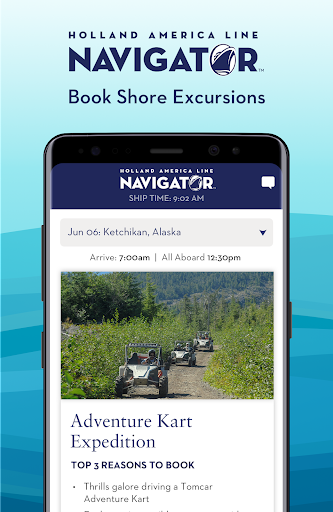 Utilizzare l'app Holland America Navigator quando è in porta per controllare il tuo itinerario quotidiano, prenotare escursioni a terra ed effettuare prenotazioni di ristoranti.Quindi, puoi semplicemente rilassarti e goderti il tuo tempo a terra, sapendo che non ti perderai mai un evento importante durante la tua crociera.