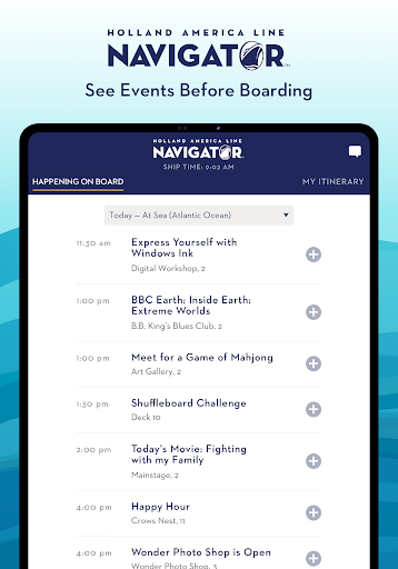 Non importaSe sei nuovo nella crociera o un ospite di ritorno, Navigator è disponibile e funziona con All Holland America Line Ships con funzionalità completa ... quindi scarica oggi!