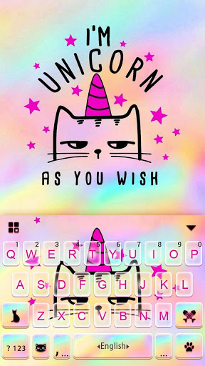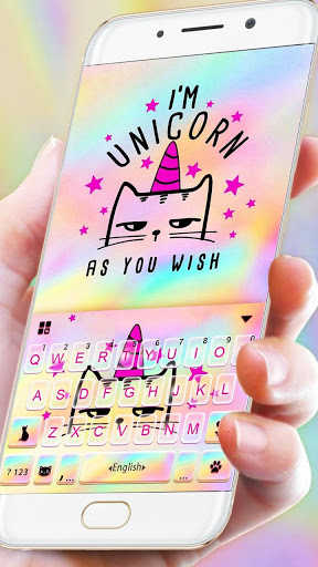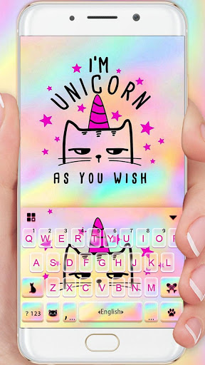 * Enjoy Holographic Unicorn Cat Keyboard Theme with cute emoji and delicate fonts.
