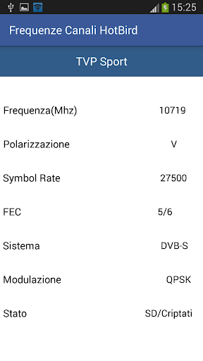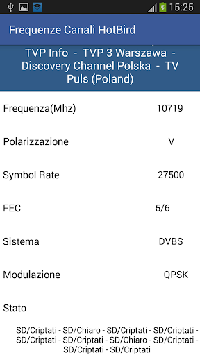 • Informazioni dettagliate per ciascun canale (frequenza - Polarizzazione - SR -FEC -Modulation -Sistema -. Stato del canale (SD o HD / crittografata o trasparente))