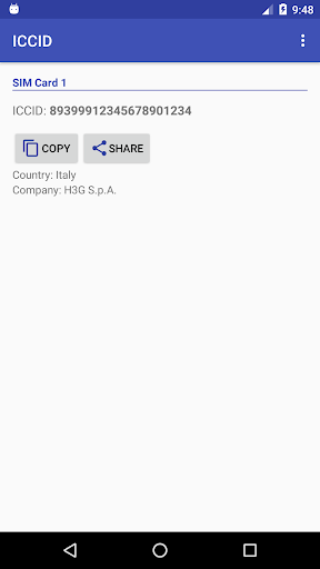Questa applicazione permette di ottenere il valore rapidamente ICCID senza tirare carta SIM. Inoltre, visualizza le informazioni relative alla carta SIM emittente.