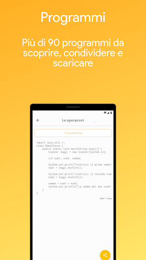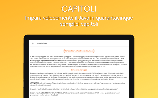 Imparare Java è supportata anche da Tablet Android con android minimo 5.0, è consigliato usare dispositivi con un schermo minimo di 4,3 pollici, è consigliato ruotare lo schermo per una migliore lettura e comprensione dei testi e dei programmi.