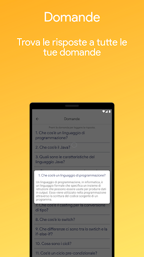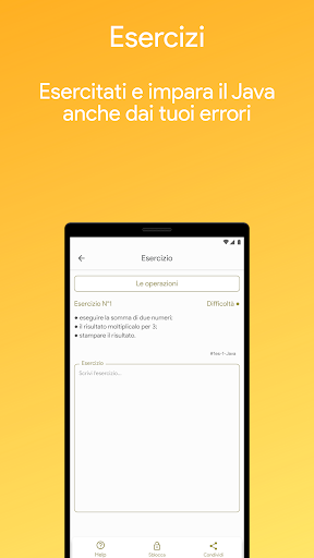 L’applicazione ha un’interfaccia molto semplice e può essere usata da tutti. Imparare Java è offline e si può utilizzare in qualsiasi momento e luogo. È consigliata soprattutto per chi vuole imparare le basi del linguaggio di programmazione Java ma anche per chi vuole approfondire o ripassare.
