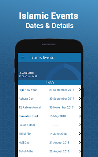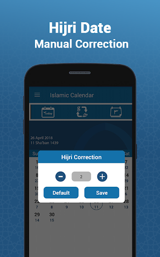 Il calendario islamico 2018, come qualsiasi altro calendario si basa sul calcolo, Dà solo date stimate e ha una pratica impostazioni di correzione Hijri che puoi applicare. Il calendario non si basa sull'avvistamento reale della Luna, che è richiesto per l'inizio del mese di Ramadan e Eid. Pertanto, per l'inizio di questi mesi è necessario contattare il tuo Masjid locale, organizzazione o studioso e fare la correzione nell'app utilizzando l'impostazione di correzione hijri. Possa Allah accetta le nostre buone azioni e il Ramadan Mubarak in anticipo!