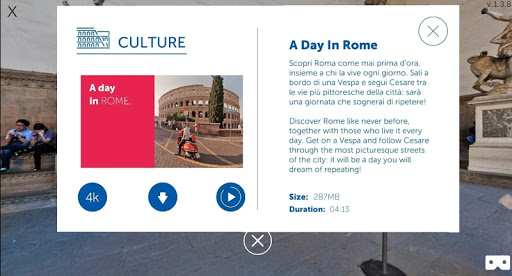 Ad oggi Italia Virtual Reality ti offre 3 esperienze immersive, ma sarà continuamente aggiornata con nuovi contenuti, che ti saranno notificati tramite push notification.