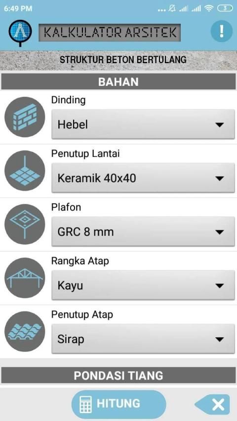Aplikasi Kalkulator Arsitek – A adalah aplikasi yang dapat membantu merancang struktur beton bertulang dengan bentang tidak lebih dari 12 meter. Dalam aplikasi ini, bahan kolom, balok, dan plat lantai sudah ditentukan yaitu beton bertulang. Sistem pondasi adalah pondasi titik dan pondasi dalam dengan tiang pondasi (pile) berbahan beton prategang yang berbentuk spun pile dan square pile.