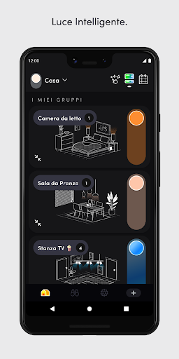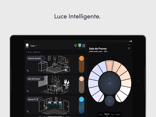 - Gruppi: controllo facile di tutte le luci in un gruppo facile, inclusa accensione,spegnimento e oscuramento con un tocco dalla Home Dashboard.