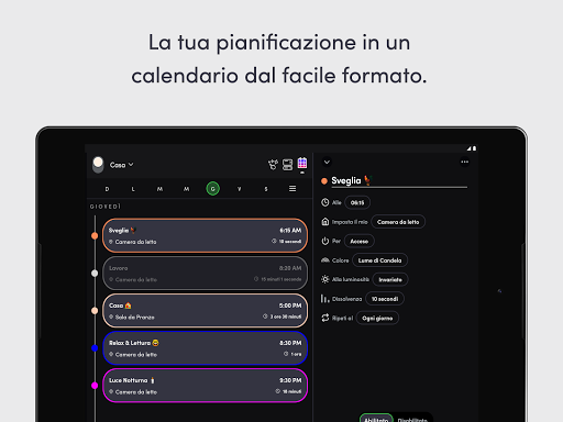 - Pianificazione: automatizza le tue luci per affievolirsi, cambiare colore e accendersi/spegnersi, il tutto in una semplice visualizzazione in stile calendario.