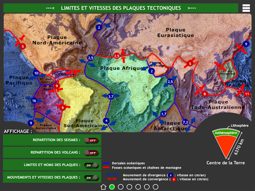 1- I piatti: animazione per situare la distribuzione di terremoti e vulcani e quindi i limiti dei piatti principali , così come le loro velocità di spostamento.