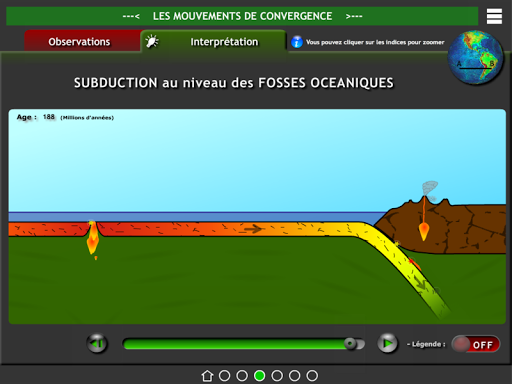 2- Espansione oceanica: animazione per comprendere il funzionamento di un dorsale oceanico, all'origine dell'espansione dell'oceano (movimento della divergenza) e del vulcanismo effusivo.> 3- Sottotabilità: Animazione per capire Il funzionamento di un pozzo oceanico all'origine del fenomeno della subduzione (movimento della convergenza) e del vulcanismo esplosivo.