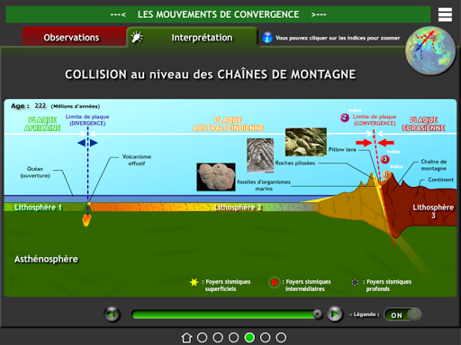 4- collisione: animazione per comprendere la formazione delle catene della montagna dopo la collisione tra due piatti litosferici (movimento della convergenza).