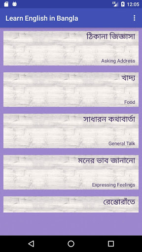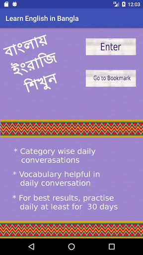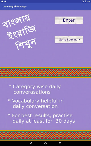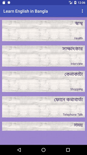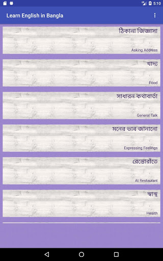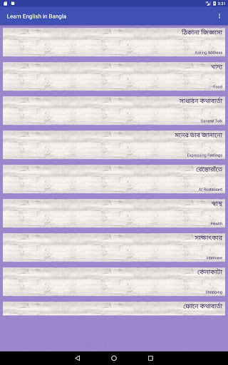Bangla to English speaking makes easier for the user to understand English. Learn English in Bangla application has audio support for learning the pronunciation of words and conversation. Learning Bangla to English can be easier for the native Bengali speakers