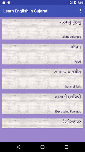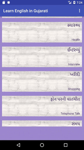 Learn English in Gujarati application is designed to make learning English in Gujarati in easy way. Learn English in Gujarati application focus on daily used conversation and words on following topics such as