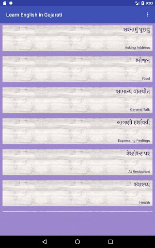 Learn English with Gujarati application also provides extra vocabulary for daily words for fruits, vegetables, relations, household and many more...