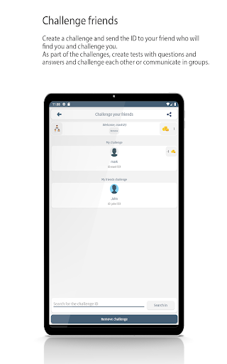 Crea una sfida e invia l'IDal tuo amico che ti troverà e ti contatterà.Come parte delle sfide, crea test con domande e risposte e sfida a vicenda o comunica in gruppi.