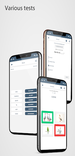 testare la tua conoscenza dei diversi tipi di test offerti dall'app, come: connettere parole che hanno lo stesso significato, trovandoLa risposta corretta nell'immagine, traducendo la parola o la frase, ascoltando la frase e poi scrivendola, pronunciando la frase che appare, e altro ancora.