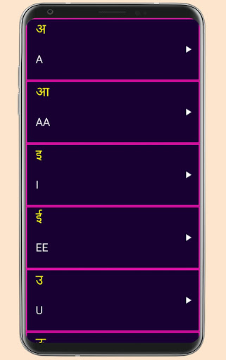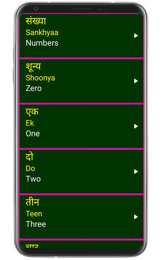 Tutti gli alfabeti hindi e tutti i numeri hindi sono coperti nell'app.I numeri hindi da 0 a 1 miliardo sono coperti nell'app.Tutti gli alfabeti hindi (हिन्दी अक्षरमाला) hindi aksharmaala composto da vocali (स्वर) Svar e consonanti (व्यजजन) Vyanjan sono forniti nell'app.