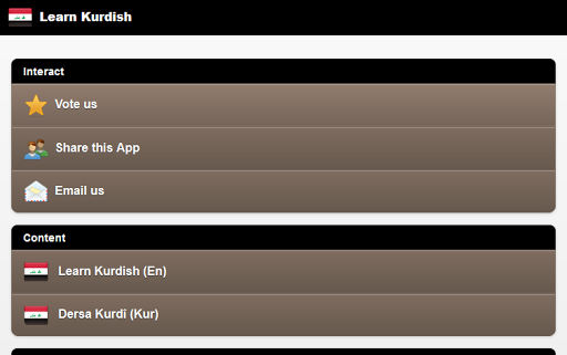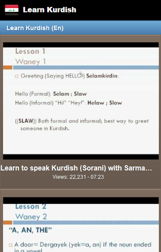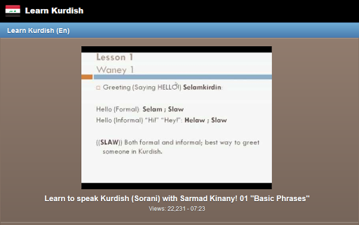 Se hai sempre desiderato imparare curdo, con questa applicazione è possibile farlo facilmente. Per saperne di parole ed espressioni in lingua curda con le nostre lezioni selezionate. E 'molto facile ed intuitivo. Prima di andare a scuola, si può cercare di imparare qualcosa dal curdo sul tuo cellulare o tablet. E 'adatto per tutti, per chi parla inglese, turco, arabo, o altre lingue o lingue. Basta seguire il tutorial selezionati e imparare a scrivere, parlare curdo in pochi giorni.
