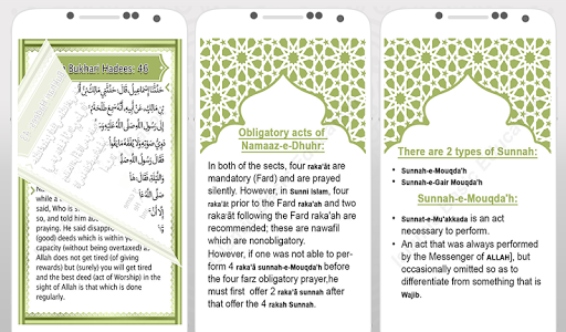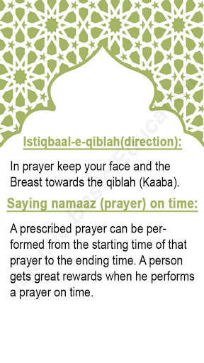 L'app contiene tutto Gli atti obbligatori della preghiera (Namaz) e di tutti e 30 Essentials of Prayer (Waajibaat-e-Namaz). La guida su come stare in preghiera, come recitare Corano in preghiera (Salat), come sedersi a Tashah-Hud, come Per recitare Du'aa-QUNOLOOT (invocazione di omaggio) e tutti gli atti completi di preghiera.