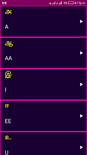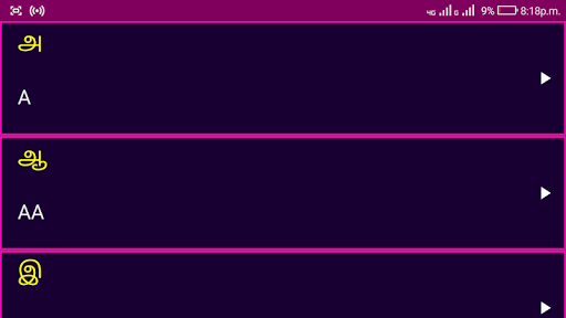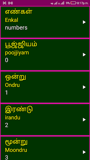 each Tamil Alphabet and Tamil number. This app works Offline too.