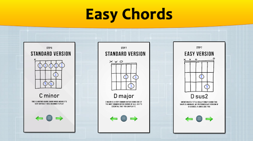 Le app di apprendimento della chitarra consistono di imparare chitarra corda e apprendimento della chitarra attraverso la canzone con il suo accordo.Questi accordi per chitarra principianti sono usati in migliaia di canzoni di chitarra e, poiché sono mobili, è possibile utilizzare come riprodurre accordi per chitarra in qualsiasi chiave.