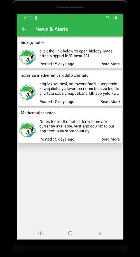 Hapa utaweza kutapa notes za masomo yote, mitihani ya marudio ya kitaifa na majibu, mtihani ya ndani na majibu yake. Pia mwanafunzi ataweza kufanya mtihani wa kujipima na kupata majibu hapo hapo.
