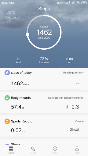 Registra il conteggio giornaliero dei passi, calcola il consumo giornaliero di calorie, distanza in movimento, tempo.