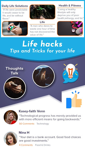 Life Hacks sono consigli semplici e intelligenti per alleviare le attività quotidiane e migliorare i compiti quotidiani e migliorare lo stile di vita. Condividi il tuo feedback o suggerimento in comunità. Rimani connesso e sintonizzato con pensieri.