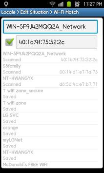 Wi-Fi Match gives you a condition based on a Wi-Fi name. There are many Wi-Fi hot spots. So you can find a Wi-Fi SSID, the name of the Wi-Fi hot spot, in the location where you want your phone to be a specific condition; vibrate mode, turn on/off Bluetoth, etc.