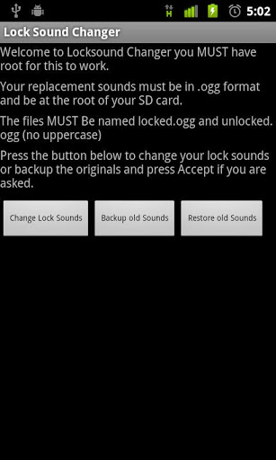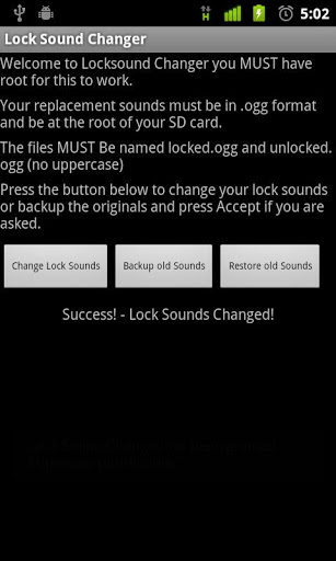 REQUIRES ROOTchanges the locksound of your android device with anotherogg stored on the sdcard will also backup for original lock sound