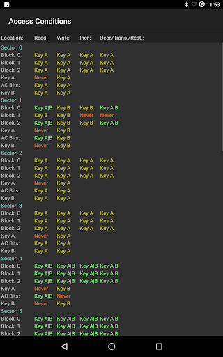 • Visualizza le condizioni di accesso classico mifare come tabella