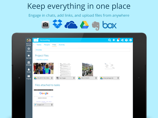 - Attachments - Keep your information together by adding file attachments, images, links, and cloud files to your tasks and projects. Attach Evernote, Google Drive, Dropbox, Box, and OneDrive files, or upload your own files and photos.