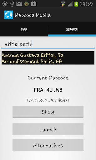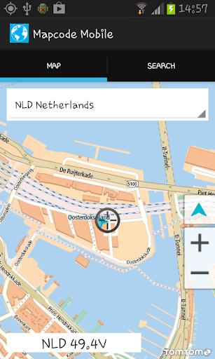 Mapcode Mobile can determine the mapcode at your location – or any other location (which you can point out on a map, search by name, or even enter by latitude and longitude).