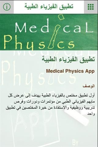 عن التطبيق, تواصل معنا, هنا البداية, الجمعية السعودية للفيزياء الطبية, الفيزياء الطبية, تقويم الفيزيائي الطبي, المنظمات الدولية, تطبيقات مهمة, حسابات و مجموعات, حسابات مهتمه بالتخصص, حسابات مهتمه بالتخصص, مدونات, Video, LiveAlbum, Photos, رأيك يهمنا