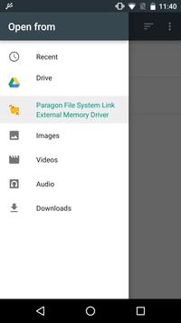 Paragon File System Link is a document provider, based on Storage Access Framework (SAF). It provides access to device storage, cloud services storage and USB storage and allows you to work with photos, videos, documents and other files.