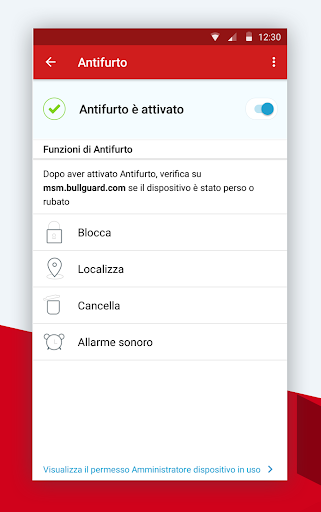1. BullGuard Mobile Security richiede i permessi di amministratore del dispositivo per attivare il modulo Antifurto. In caso di furto o smarrimento, con il modulo Antifurto attivo è possibile bloccare, individuare o cancellare il dispositivo dalla dashboard di Mobile Security Manager.