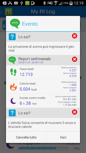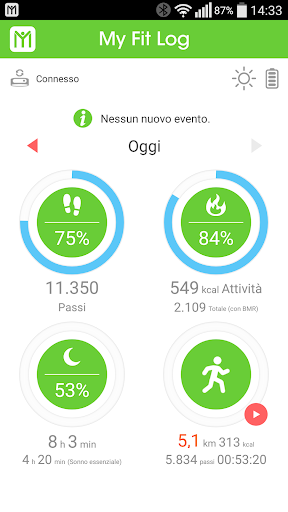 My Fit Log funziona perfettamente con Wristband/Smartwatch, che rileva/registra i progressi nell'allenamento e la qualità del sonno nella vita quotidiana. Mentre Wristband/Smartwatch consente di impostare obiettivi diversi per motivare se stessi a provare allenamenti più intensi, My Fit Log offre solleciti per tenersi informati sui vari avvisi direttamente da Wristband/Smartwatch, tra cui chiamate in arrivo, e-mail, messaggi, avvisi di eventi di calendario o notifiche push da altre app di social network. Durante l'allenamento, si visualizzano i dati in tempo reale dei progressi nell'allenamento da My Fit Log sullo schermo di Wristband/Smartwatch, tra cui frequenza cardiaca, velocità, distanza, calorie, ecc. Oltre a seguire gli allenamenti, My Fit Log consente anche di creare programmi di allenamento personalizzati per praticare e raggiungere diversi livelli di obiettivi di fitness. L'allenamento è più divertente se effettuato con amici. È possibile utilizzare la comoda funzione Amici di fitness per invitare gli amici a unirsi a partecipare all'allenamento e motivarsi a vicenda con parole di incoraggiamento. Inoltre, My Fit Log consente di effettuare facilmente il backup o il ripristino di tutti i dati di allenamento utilizzando Google Drive in pochi passi.