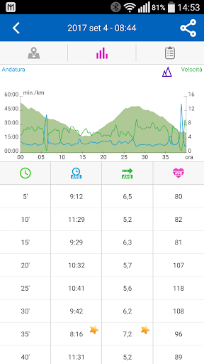 o Mostra le statistiche/le tabelle dettagliate di andatura, distanza, ora, velocità, altitudine e calorie bruciate
