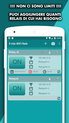 Grazie a questa App puoi controllare i relè collegati al tuo arduino o collegati al modulo ESP8266 o ESP32 o simili. Puoi aggiungere tutti i relè che desideri dallo stesso modulo o da moduli diversi. Il codice è incluso nell'applicazione per poterlo caricare nell'IDE di Arduino e lo schema di connessione tra ESP e relè.