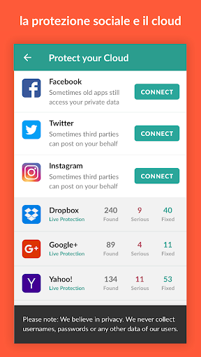 Scarica l’app Privacy Cleaner per cercare i rischi per la tua privacy e i tuoi dati in Facebook, Instagram, Twitter, Google , Dropbox e nelle app che hai installato nel telefono.