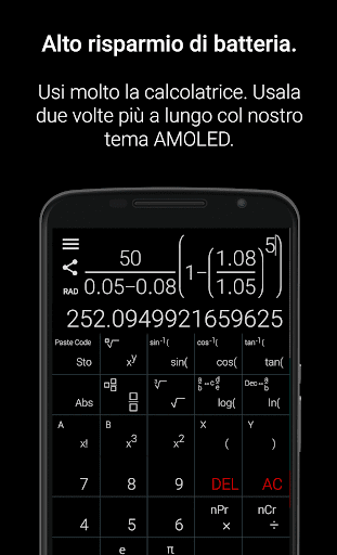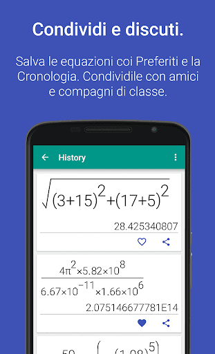 Le altre app ti obbligano a inserire le equazioni su una singola linea come negli anni '70 del secolo scorso. Il nostro input naturale risolve questo problema permettendoti di inserire le equazioni come le scriveresti sulla carta, usando frazioni, radici, esponenti e altro. E' chiamato "natural display" ed è una funzionalità comune su calcolatrici scientifiche e noi l'abbiamo finalmente portato su Android!
