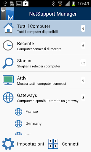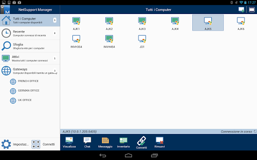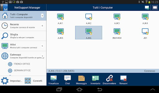 Il nuovo Control mobile consente all’utente di cercare e di connettersi rapidamente ai computer locali tramite l’indirizzo IP o il nome di PC, oppure di cercare, visualizzare e connettersi ai computer remoti utilizzando il componente gratuito Internet Gateway di NetSupport Manager.