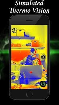 Night Vision Thermal Color Filter Effect is a App turning your Camera Vision with Thermal Colors. Changing bright pixels up the color line into yellow and red ones and darker pixels in lilac and blue, Night Vision Thermal Color Filter Effect turns your view in a heat and cold detector simulation. Use the Night Vision Goggles Button to activate the Thermal Effect Filter. Go through the instructions and press the flashlight button, if you want to use the bright flashlight in addition. Use this Night Vision Thermal Filter if you want to turn into a Color View or use the flashlight and watch through Camera if you walk by night to not stumble about anything on the ground now!
