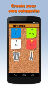 Note Droid, l'applicazione che ricorderà tutto al tuo posto. È finita l'era delle note sparse nelle tasche, ora è possibile avere tutto organizzato ed archiviato ad un solo click di distanza. Crea liste in funzione delle tue necessitá (lavoro, compleanni, spesa,...) ed utilizzale per archivare i tuoi promemoria. Con un solo sguardo potrai visualizzare tutte le attività ordinate per importanza grazie ad un semplice sistema di colori. Importa ed esporta i tuoi promemoria e condividili con i tuoi amici o colleghi di lavoro. Non controllare tutto il giorno il cellulare, crea sveglie per ogni promemoria e Note Droid ti avviserà al momento giusto. Ed il tutto è totalmente gratis e con la garanzia di qualità di F&F Dev.