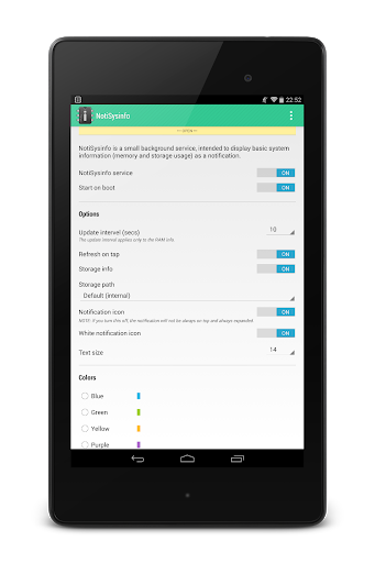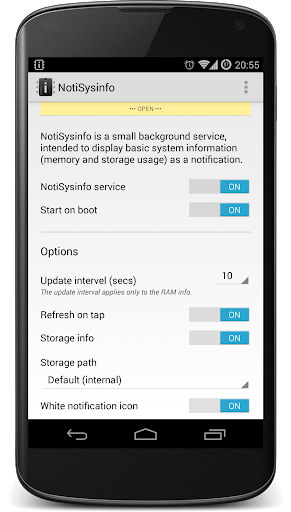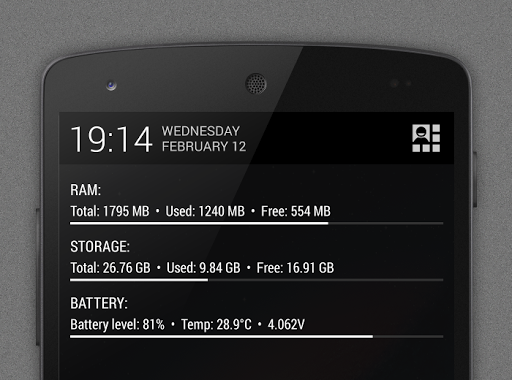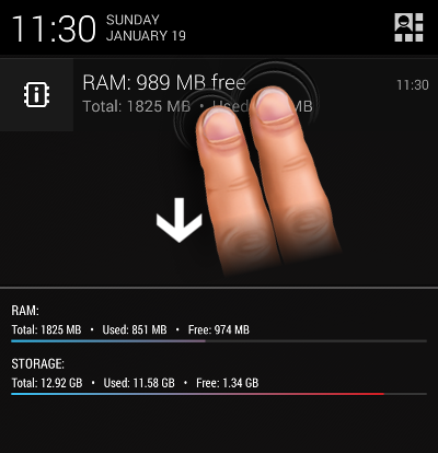 NotiSysinfo (Notification System Information) is a small system monitoring background service. It displays system information as a notification, thus you can check your device's RAM, storage, battery usage whenever you want, without starting any application.