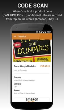 Se vengono trovati dei codici prodotto ( EAN, ISBN, UPC ... ), alcune informazioni aggiuntive vengono recuperate dai principali store online (Amazon, Ebay, Zalando, Walmart ... ) in modo da fornire subito un dettaglio sui prezzi e caratteristiche del prodotto. E' anche possibile visitare lo store di riferimento per effettuare l'acquisto o vedere i commenti e le valutazioni degli utenti.