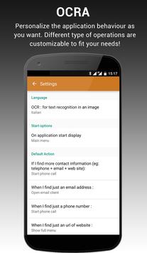 Dal menu impostazioni è anche possibile configurare nel dettaglio il comportamento dell'applicazione e adattarlo alle proprie esigenze. Ad esempio si può scegliere cosa visualizzare alla partenza dell'applicazione : funzionalità OCR, BARCODE o il menu di principale. In aggiunta è possibile personalizzare l'azione predefinita da eseguire in base ai dati trovati dopo una scansione.