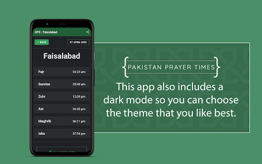 Pakistan Prayer Times is a simple and small app that allows you to view the prayer times for your city. It does not contain any extra or unnecessary features. Its only purpose is to show you prayer times for your city.